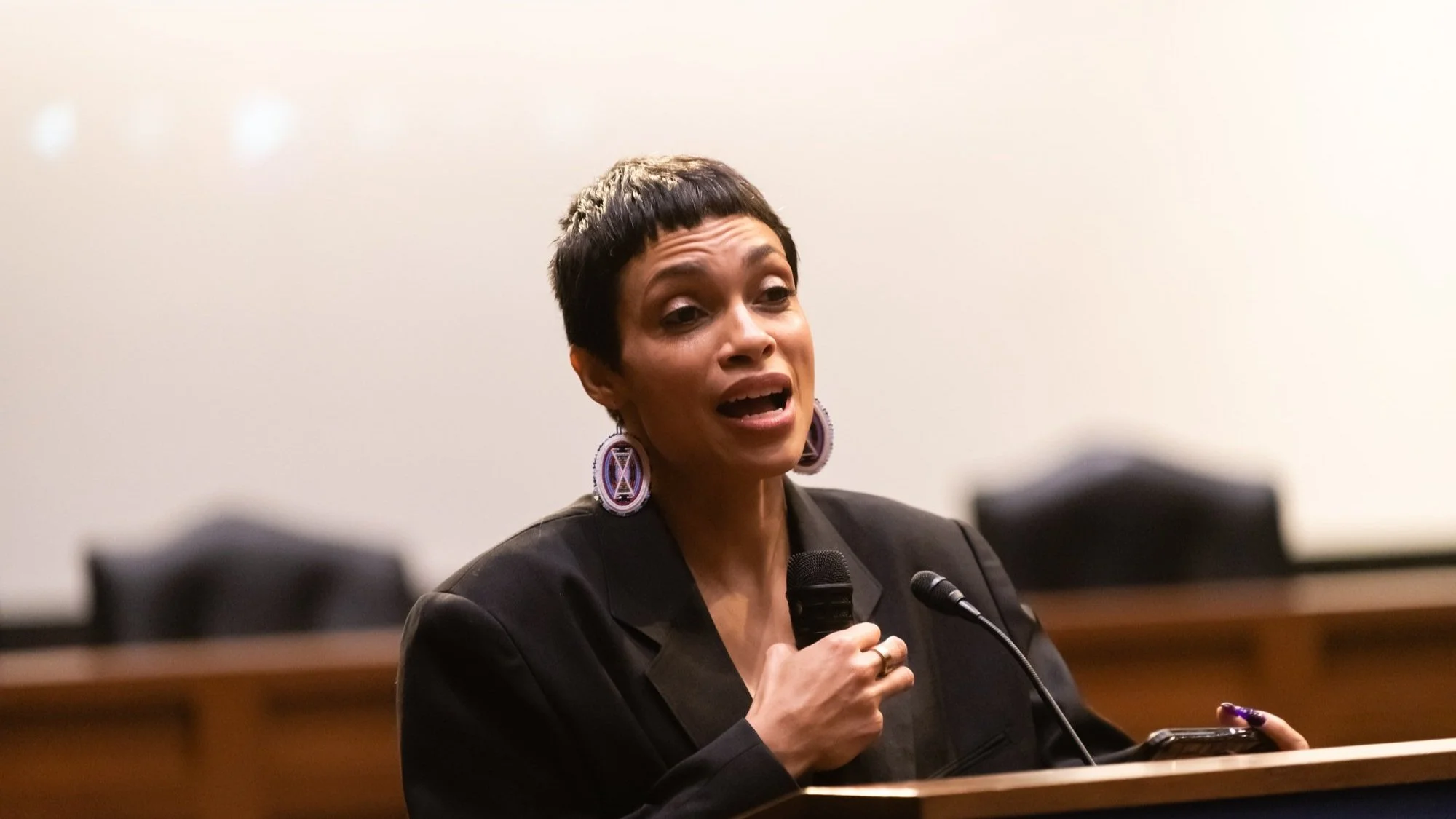 Rosario Dawson speaks to members of Congress at a Below the Belt screening.